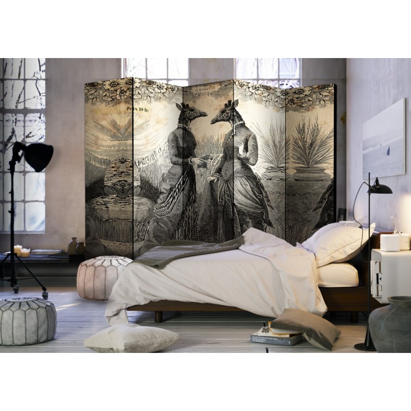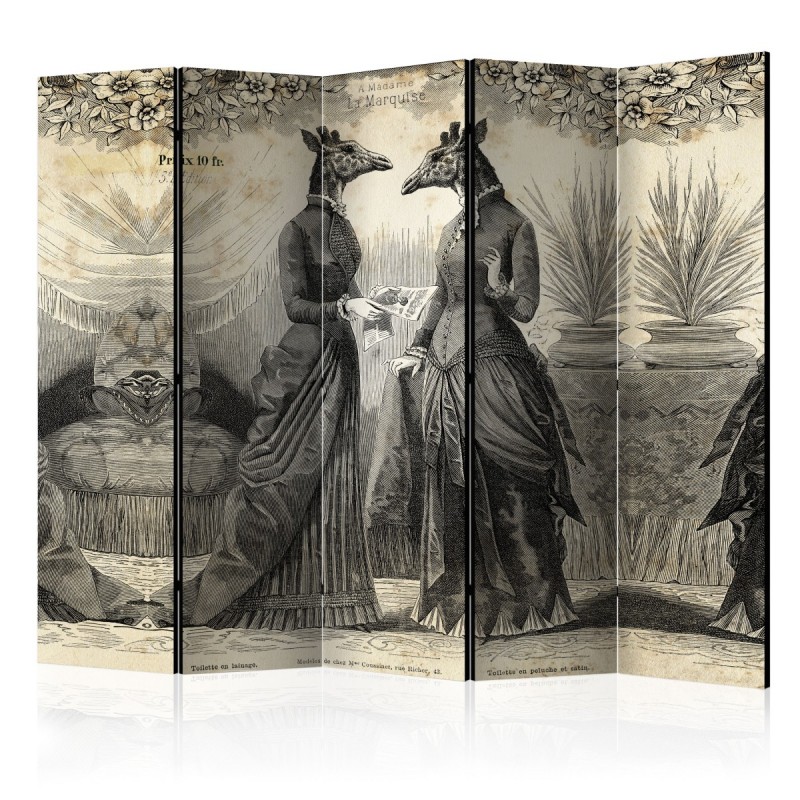 Paravanul decorativ "Conversation II [Room Dividers]" este un decor unic pentru interioarele moderne. Paravanul este compus din 5 părți, realizat din lemn și imprimat pe ambele părți. Vă va împărți spațiul în mod discret și va crea un design interior uimitor. Datorită unei realizări perfecte și a unui design original Full HD, paravanele de cameră oferă un aspect unic oricărui interior. Paravanele decorative pentru locuințe reprezintă o modalitate originală de decorare a interiorului. De remarcat este faptul că posedă aplicații practice - paravanele de cameră pot fi utilizate de ex. pentru a ascunde un uscător de rufe. Reprezintă un decor foarte original care poate fi utilizat atât în cazul spațiilor de locuit, cât și în cazul spațiilor de lucru, de ex: frizerii, cabinete medicale sau chiar și birouri de contabilitate.