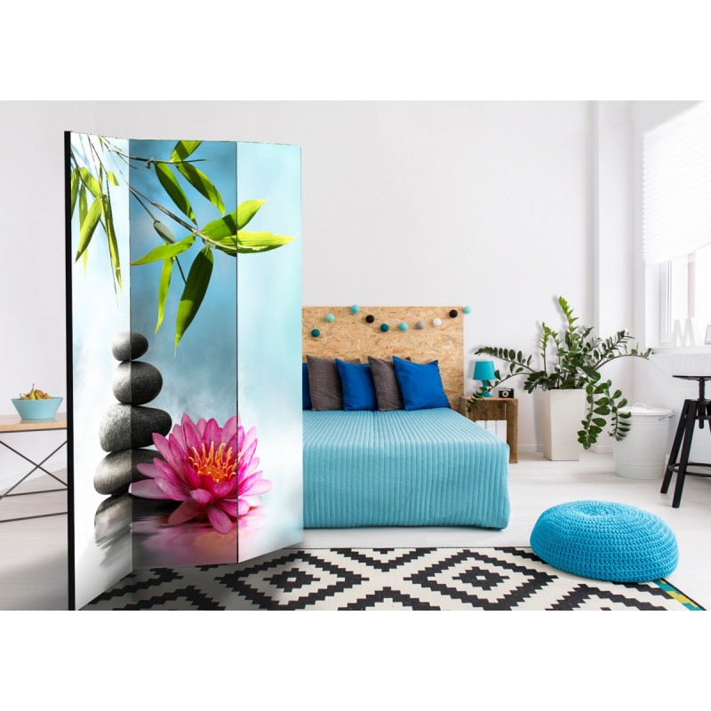Paravanul decorativ "Water Lily and Zen Stones [Room Dividers]" este un decor unic pentru interioarele moderne. Paravanul este compus din 3 părți, realizat din lemn și imprimat pe ambele părți. Vă va împărți spațiul în mod discret și va crea un design interior uimitor. Datorită unei realizări perfecte și a unui design original Full HD, paravanele de cameră oferă un aspect unic oricărui interior. Paravanele decorative pentru locuințe reprezintă o modalitate originală de decorare a interiorului. De remarcat este faptul că posedă aplicații practice - paravanele de cameră pot fi utilizate de ex. pentru a ascunde un uscător de rufe. Reprezintă un decor foarte original care poate fi utilizat atât în cazul spațiilor de locuit, cât și în cazul spațiilor de lucru, de ex: frizerii, cabinete medicale sau chiar și birouri de contabilitate.