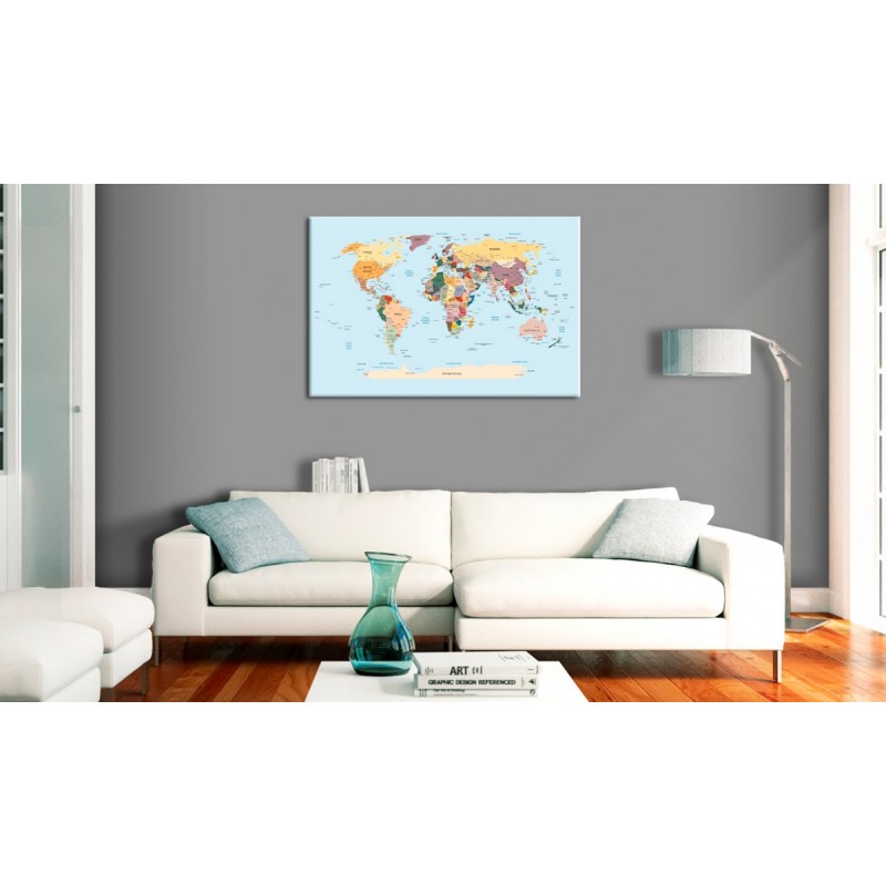 Tabloul din plută "Travel with Me [Cork Map]" este cu mult mai ușor decât decorațiunile tradiționale pentru pereți. Datorită acestui fapt panourile decorative din plută pot fi amplasate în orice loc din locuința dumneavoastră sau din birou. Pânza imprimată se aplică pe panoul din plută. Se caracterizează prin culori intense și reflectă chiar și cele mai mici detalii. Fixați pioneze sau notițe și creați pe perete un design personalizat!