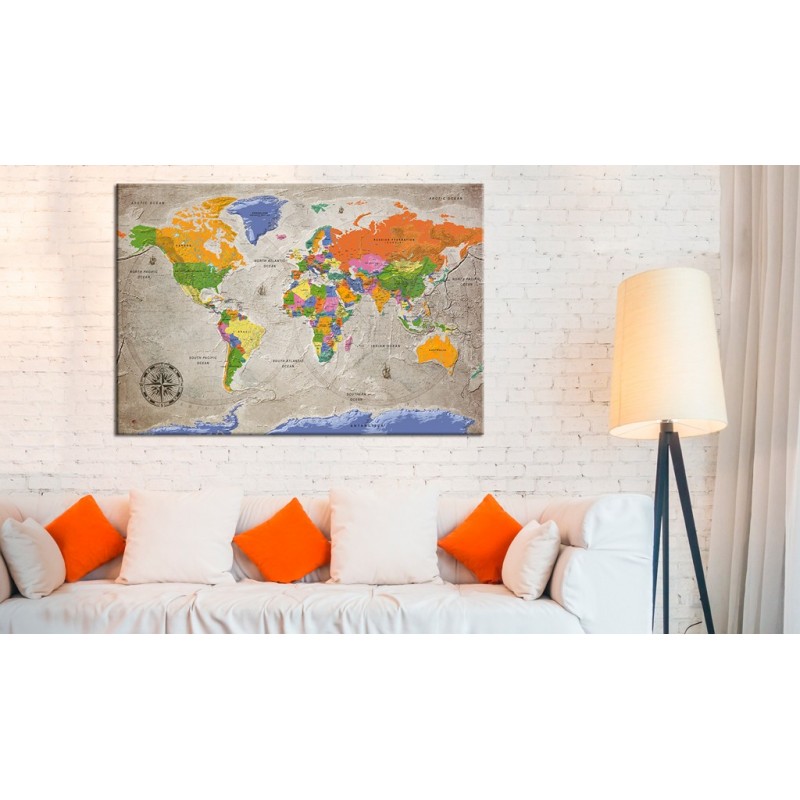 Tabloul din plută "World Map: Retro Style [Cork Map]" este cu mult mai ușor decât decorațiunile tradiționale pentru pereți. Datorită acestui fapt panourile decorative din plută pot fi amplasate în orice loc din locuința dumneavoastră sau din birou. Pânza imprimată se aplică pe panoul din plută. Se caracterizează prin culori intense și reflectă chiar și cele mai mici detalii. Fixați pioneze sau notițe și creați pe perete un design personalizat!
