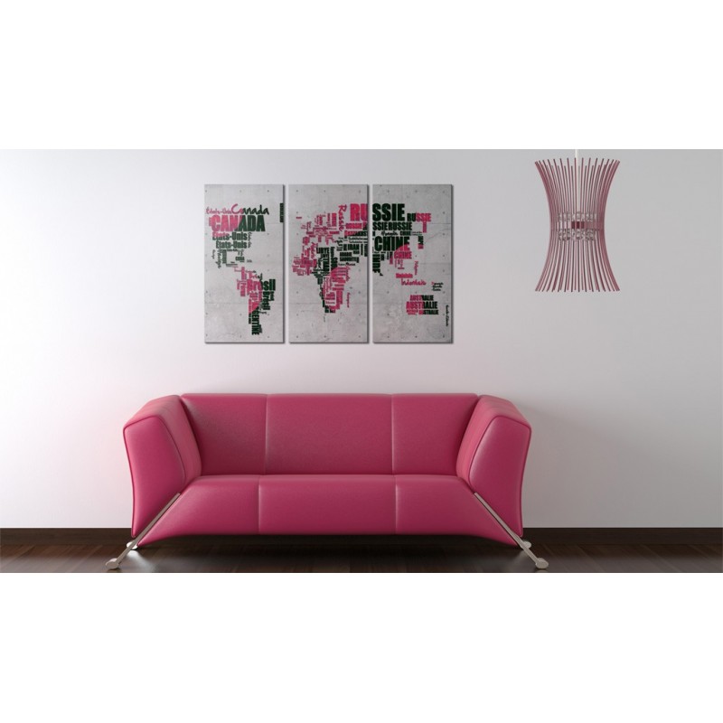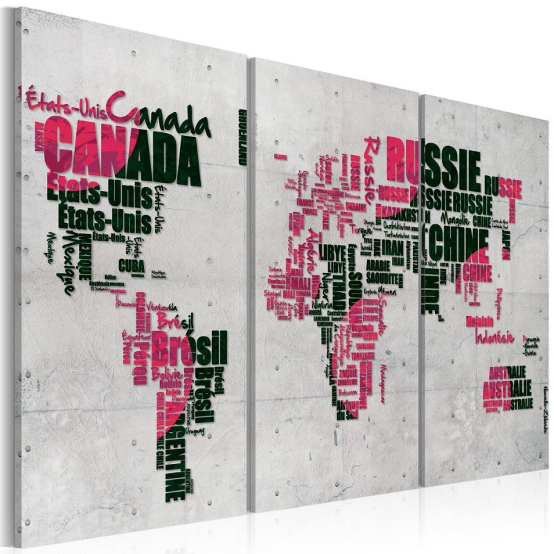 Tabloul de înaltă calitate "Map of the World (French language) - triptych" este imprimat pe o pânză flaușată, care reproduce perfect culorile. Este unul dintre numeroasele modele originale pe care le puteți comanda în magazinul nostru.